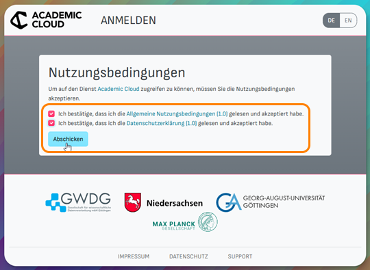 Um Chat AI zu nutzen, müssen Sie die Nutzungsbedingungen und die Datenschutzerklärung akzeptieren. Um das zu tun, haken Sie beides an und klicken Sie auf „Abschicken“. Danach öffnet sich die Chat AI-Oberfläche, auf der Sie arbeiten können.