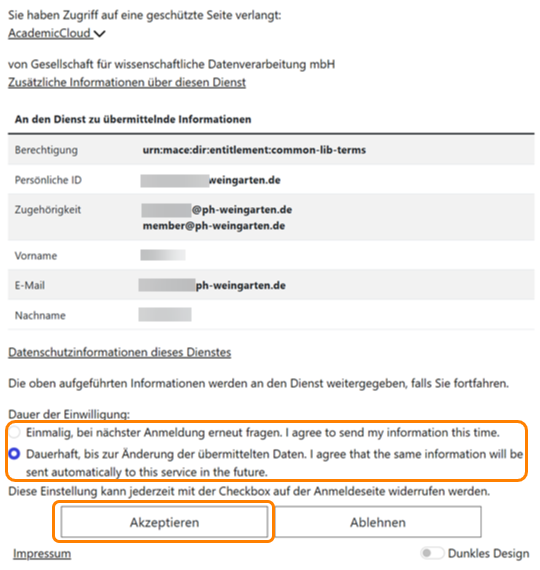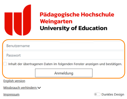 Geben Sie hier den Benutzernamen und das Passwort Ihres PH-Accounts ein und klicken Sie auf „Anmeldung“. Wenn Sie sehen möchten, welche Daten übertragen werden, haken Sie das entsprechende Kästchen an.